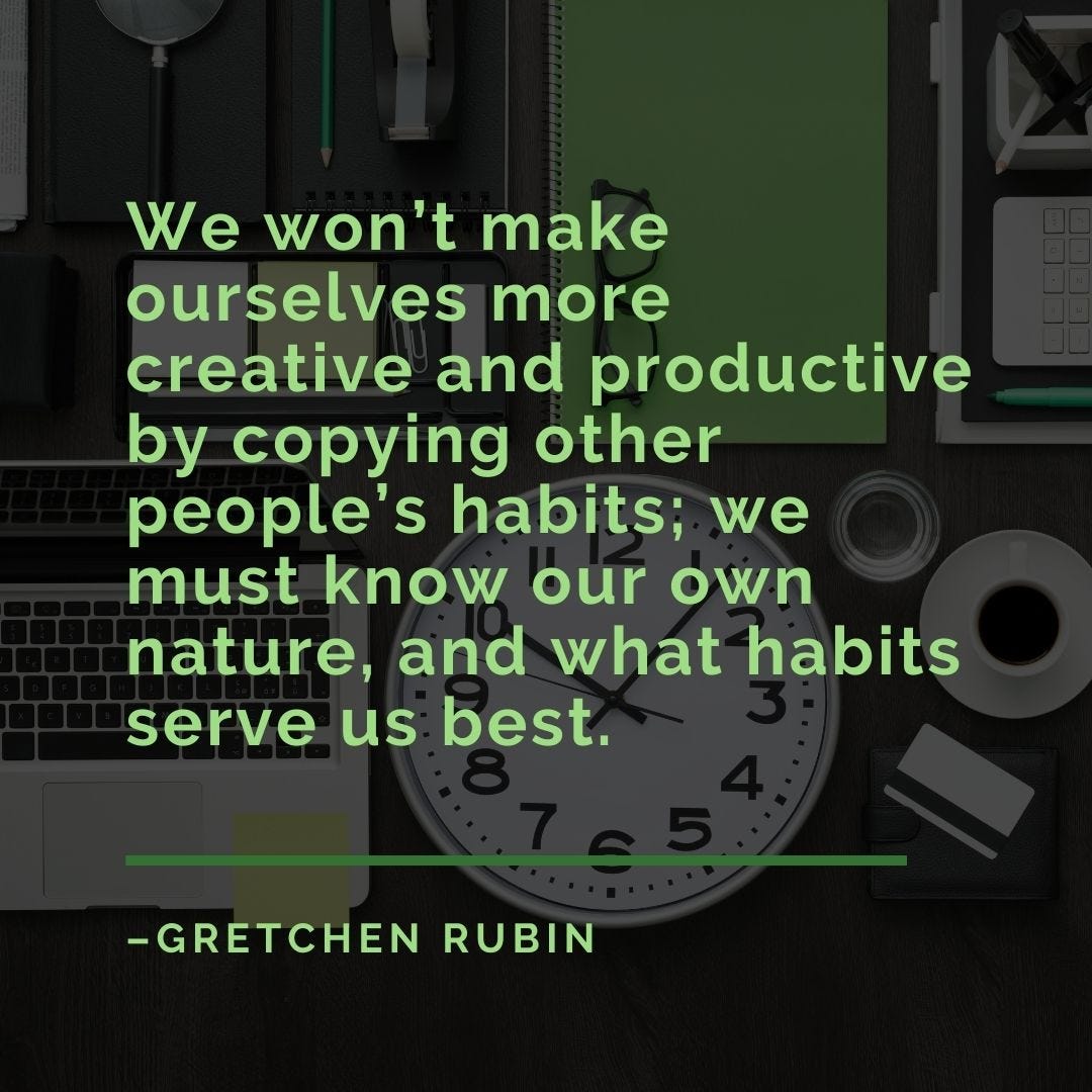 đĄ This week quote resonates with me because for many years I've been trying to fit in what I call the "early morning productive fantasy". I finally got to admit that I'm more productive and creative in the evening... that's my nature and I should not feel shame about it !